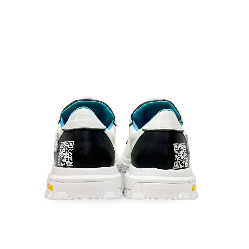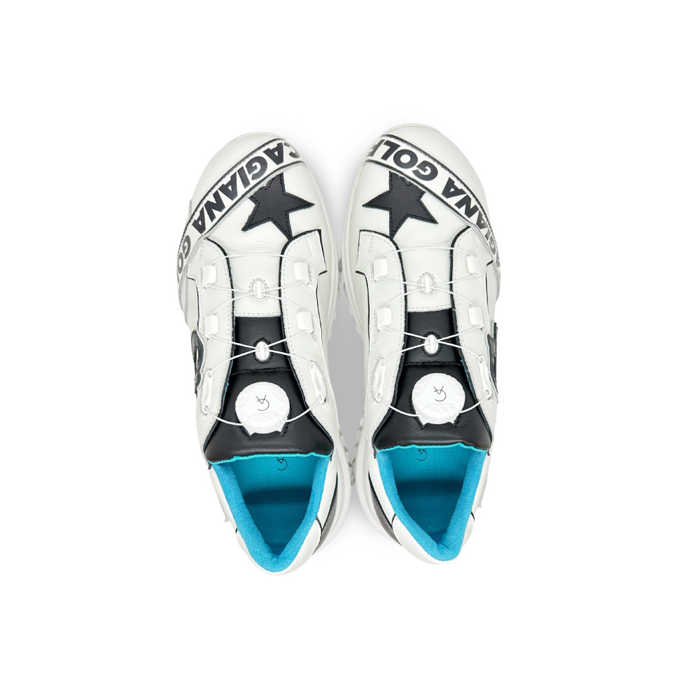 スターモチーフやロゴワッペンをステッカーのように貼り付けたデザインのローカットゴルフシューズ。踵にプリントされたQRコードからはECサイトにアクセスできるという遊び心も。Vibram MEGAGRIPソールが、あらゆるライで卓越したグリップ力を発揮し、優雅さと機能美が融合した、至高のプレーを約束する一足です。