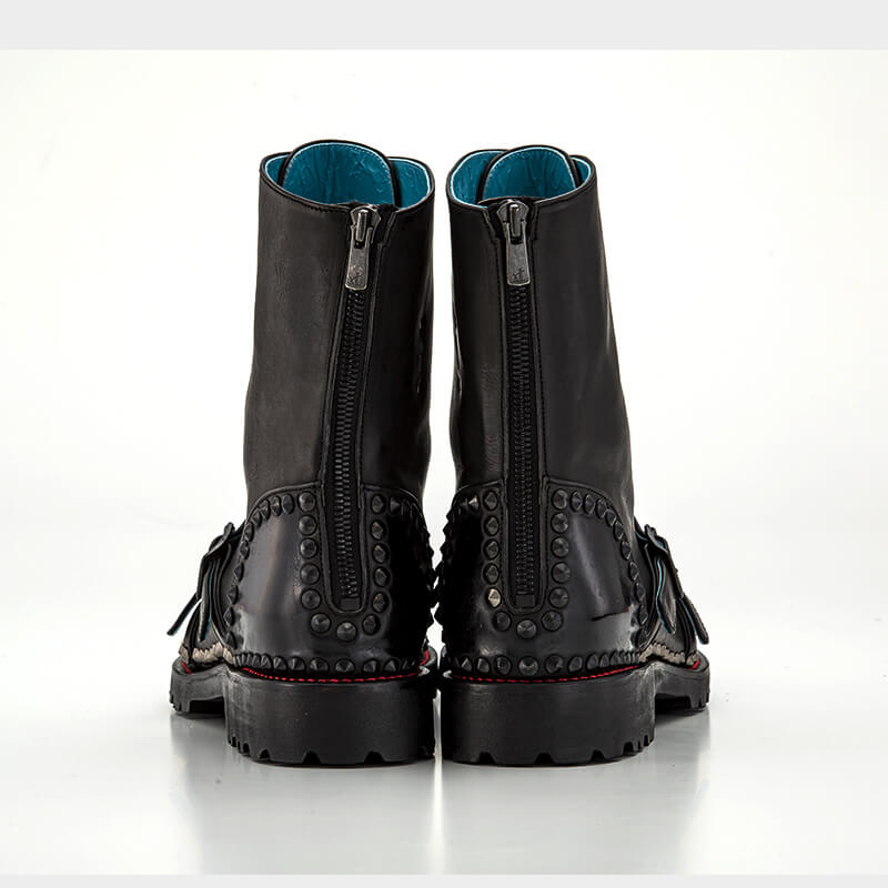 靴の上部の”鍵穴”のマークと、甲部でクロスする2本のバックルがポイント。かかとから靴先までつながる3色のスタッズは、1つ1つ職人の手により打ち込んで仕上げます。