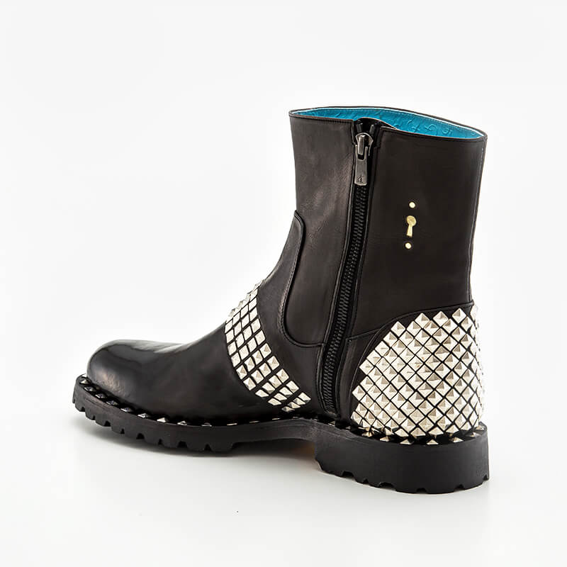 靴の上部の”鍵穴”のマークと、一際目を引くかかとと甲部にあしらわれたスタッズがポイント。スタッズは1つ1つ職人の手により打ち込んで仕上げます。