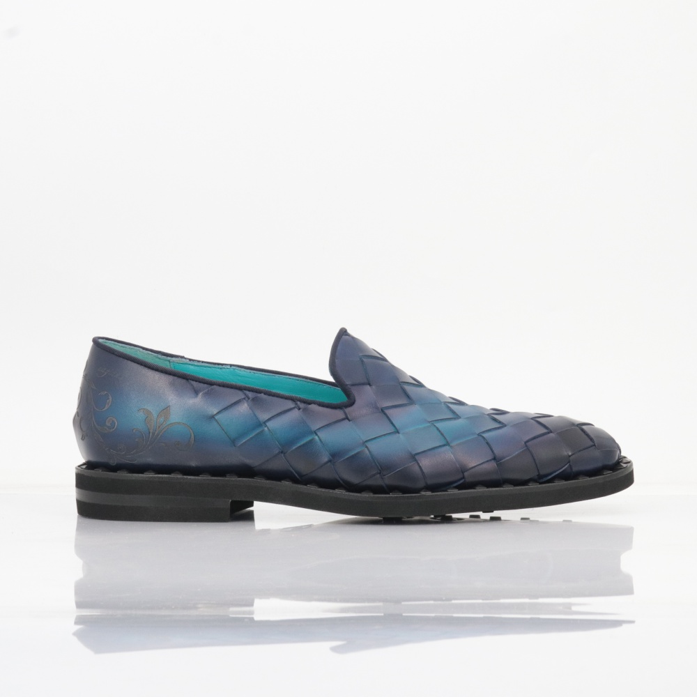 上質な革で編み込まれたイントレチャートに、パティーヌで仕上げた鮮やかなグラデュエーションの特別感が印象的。包みこまれるような爽快な履き心地が秀逸の品です。
