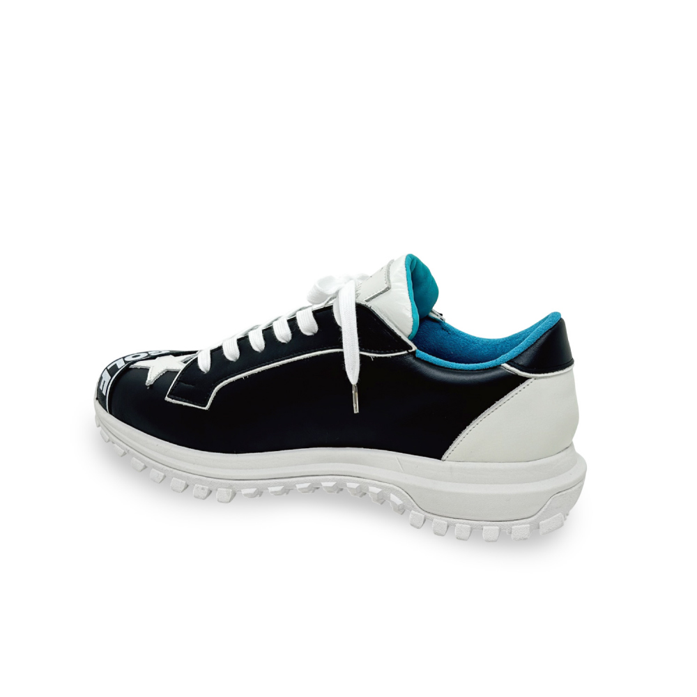 スターモチーフやロゴワッペンをステッカーのように貼り付けたデザインのローカットゴルフシューズ。踵にプリントされたQRコードからはECサイトにアクセスできるという遊び心も。Vibram MEGAGRIPソールが、あらゆるライで卓越したグリップ力を発揮し、優雅さと機能美が融合した、至高のプレーを約束する一足です。