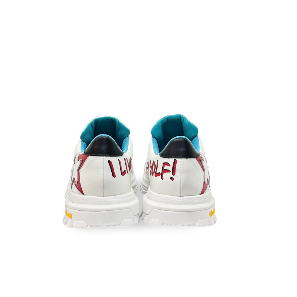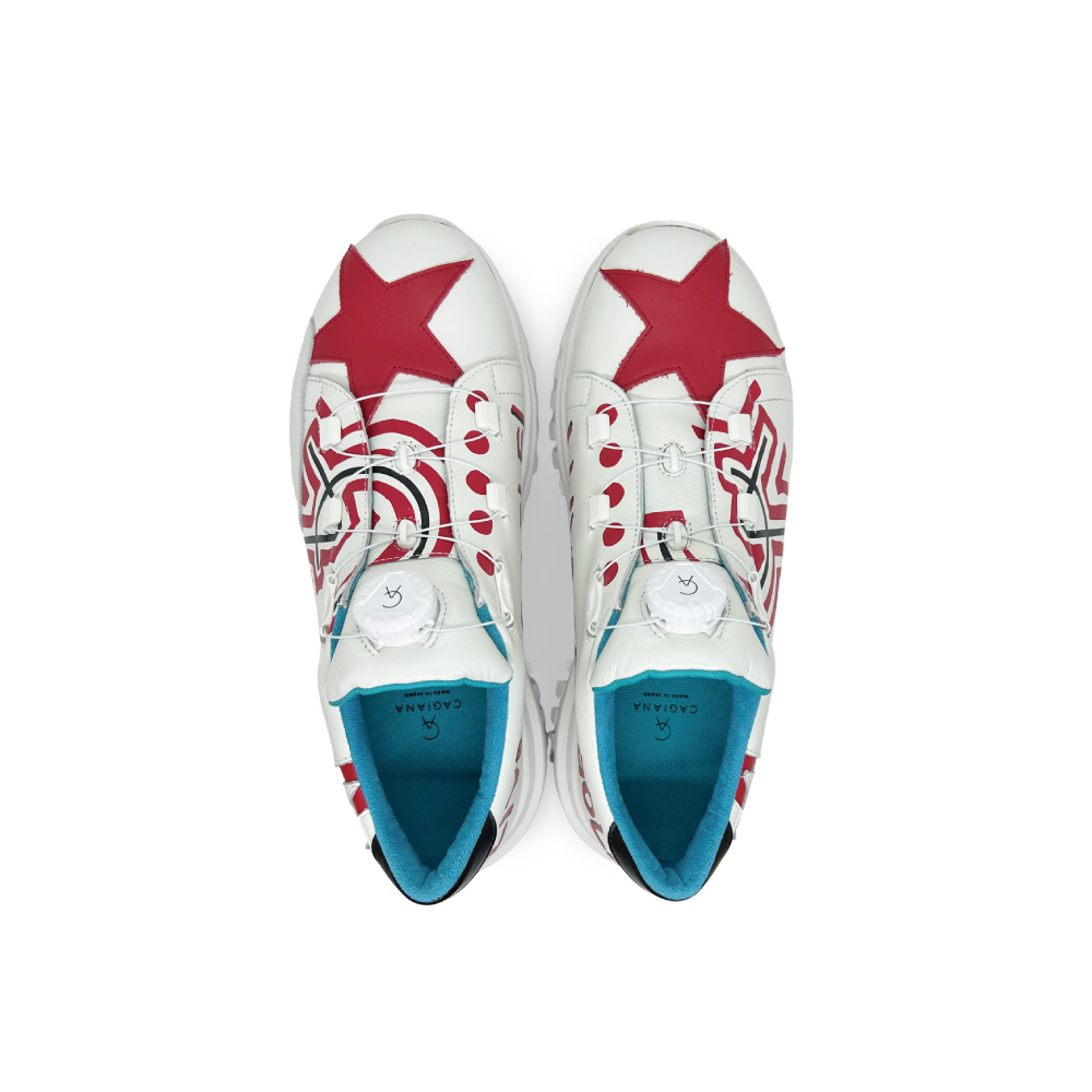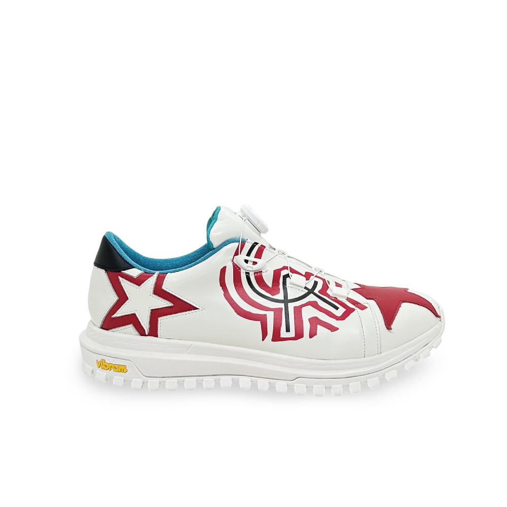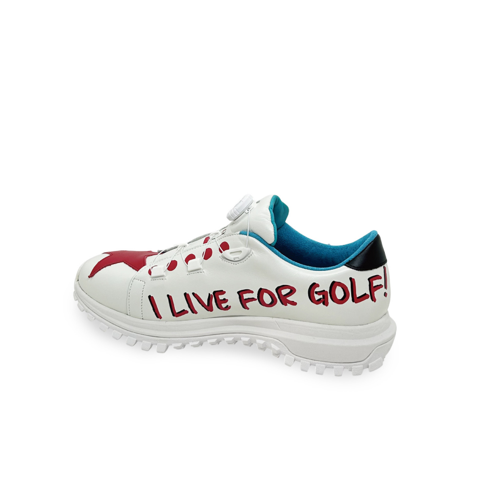 スターモチーフとカジーナアイコンのCAで構成したシューレースタイプのローカットスニーカー。クラシカルでクリーンなフォルム。内側にはI LIVE FOR GOLFのメッセージ。Vibram MEGAGRIPソールが、あらゆるライで卓越したグリップ力を発揮し、優雅さと機能美が融合した、至高のプレーを約束する一足です。