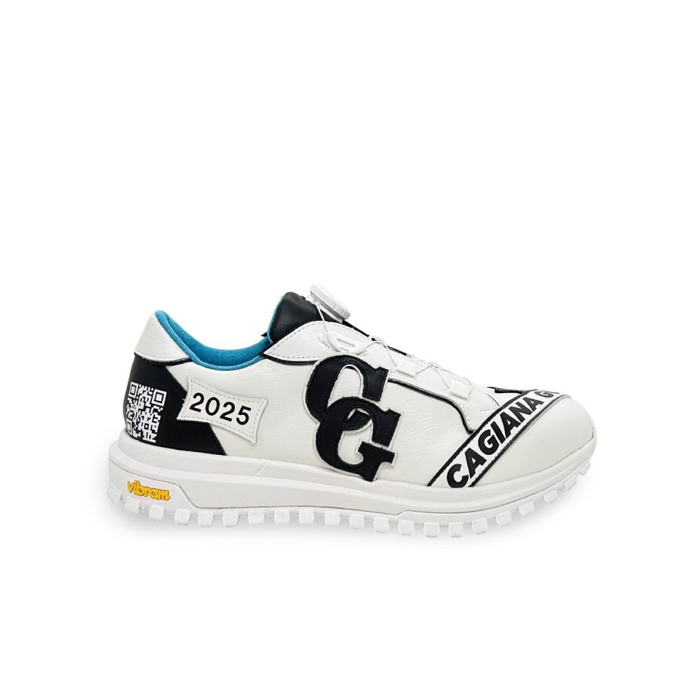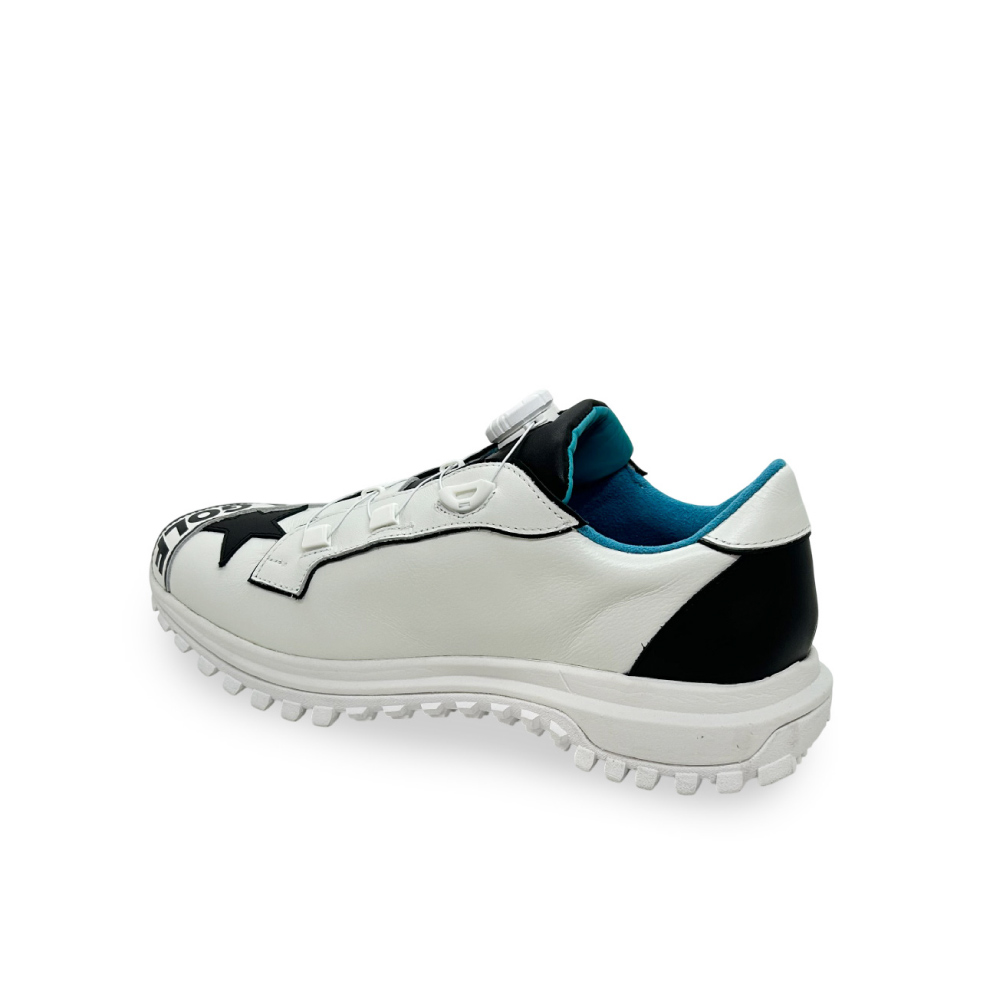 スターモチーフやロゴワッペンをステッカーのように貼り付けたデザインのローカットゴルフシューズ。踵にプリントされたQRコードからはECサイトにアクセスできるという遊び心も。Vibram MEGAGRIPソールが、あらゆるライで卓越したグリップ力を発揮し、優雅さと機能美が融合した、至高のプレーを約束する一足です。