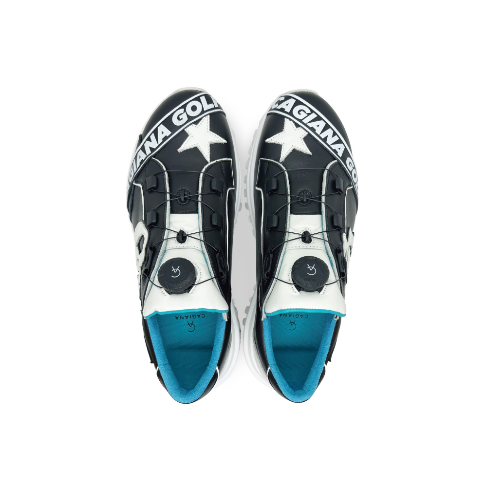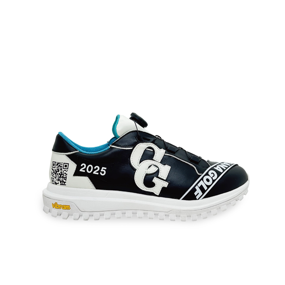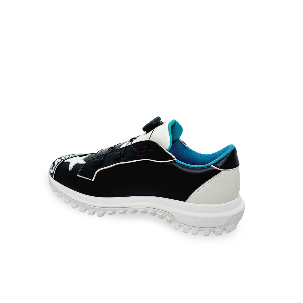 スターモチーフやロゴワッペンをステッカーのように貼り付けたデザインのローカットゴルフシューズ。踵にプリントされたQRコードからはECサイトにアクセスできるという遊び心も。Vibram MEGAGRIPソールが、あらゆるライで卓越したグリップ力を発揮し、優雅さと機能美が融合した、至高のプレーを約束する一足です。