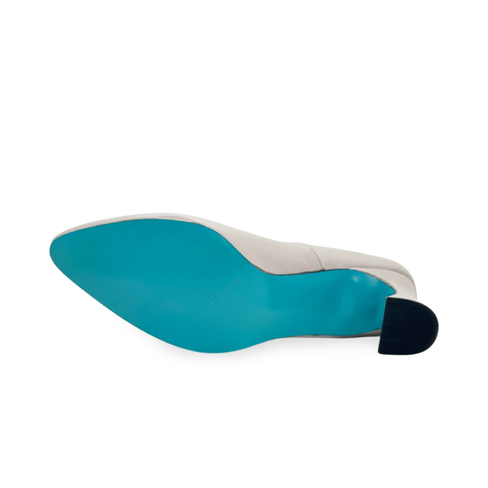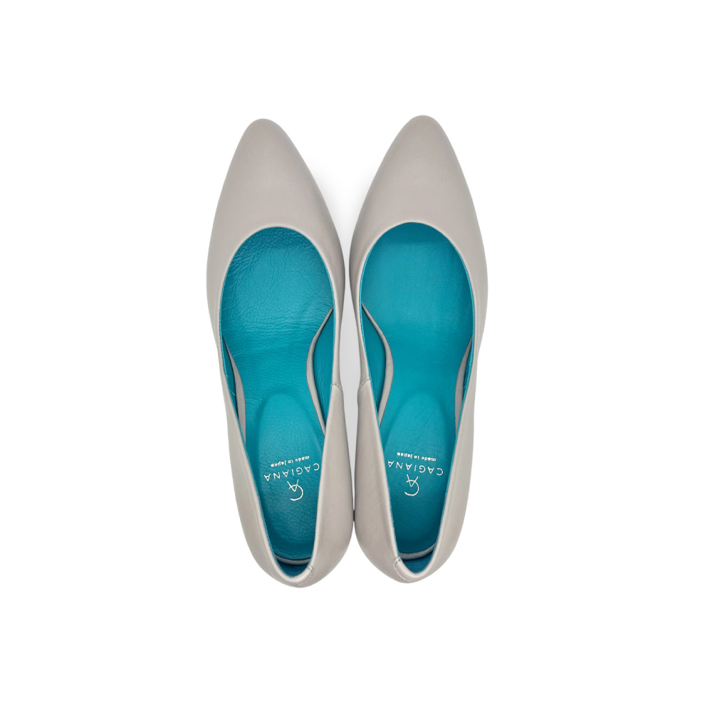 研ぎ澄まされたフォルムと、無駄のない表情。しなやかなカーフレザーの質感と、足を美しく見せるラインそのものを主役にした一足です。内側に配したターコイズブルーは静かなアクセント。装飾に頼らず、大人の女性の足元に洗練された佇まいと気品を添えます。